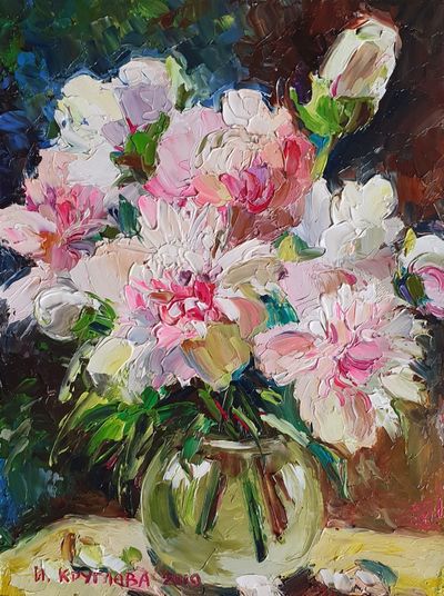 "Бело-розовые пионы", оргалит / масло, 20 х 15 см., 2019 г.