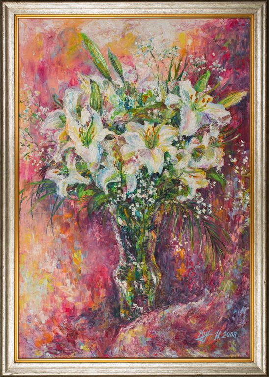 Круглова И. А. "Букет лилий", холст / масло, 80 x 55 см., 2008 г. 26 000 ₽ В корзину Купить в 1 клик В корзину Купить в 1 клик Картина оформлена в багет. Картина оформлена в багет. Описание Комментарии 0 Описание Из Самары приехал друг семьи, поклонник таланта художников и подарил букет голландских белых лилий. Прекрасный букет захотелось запечатлеть на холсте. Комментарии 0 Добавить комментарий Поделиться С этим товаром покупаютОкеан блаженства 25 000 ₽В корзинуОбернувшаясяКрасный троллейбус 25 000 ₽В корзинуСолнечный день на пруду 18 000 ₽ 30 000 ₽В корзину