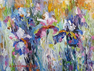 Круглова Ирина "Ирисы в поле", оргалит / масло, 15 х 20 см., 2020 г.