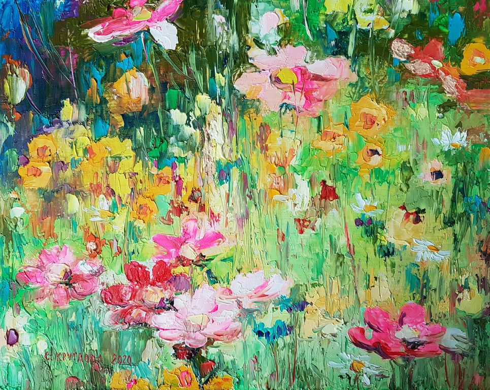 Круглова Светлана "Космеи в саду", оргалит / масло, 24 х 29 см., 2020 г.