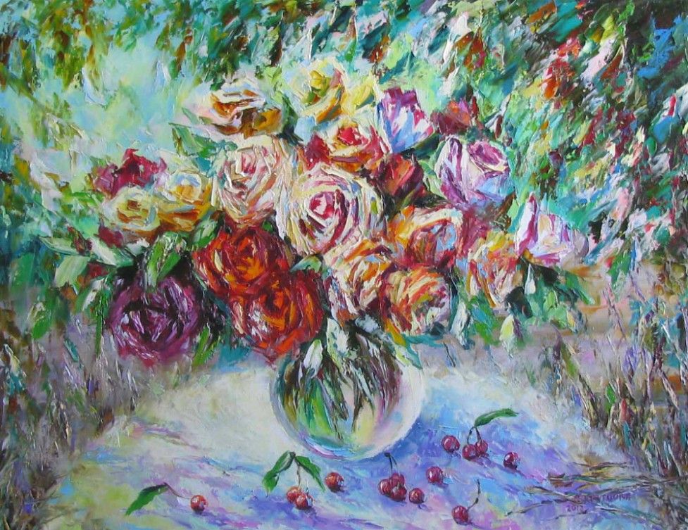 Летом сад живёт полной жизнью. В утренние часы хочется встать пораньше и побежать осмотреть всё вокруг. Всё наполняет изобилием и радует бесконечно. Поставлю розы в вазу и наберу вишни. Вот чудесный натюрморт.