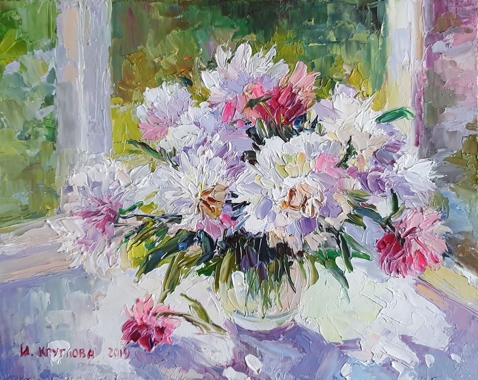 Круглова Ирина "Пионы на окне", оргалит / масло, 15 х 19 см., 2019 г.