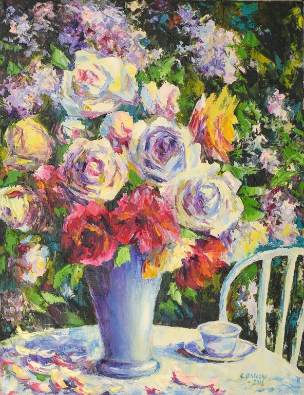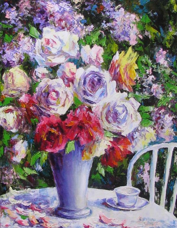 Букет роз на столе и чай около дремлющего куста сирени. Ароматы цветов кружат в воздухе, танцуя с красивыми бабочками и стрекозами.