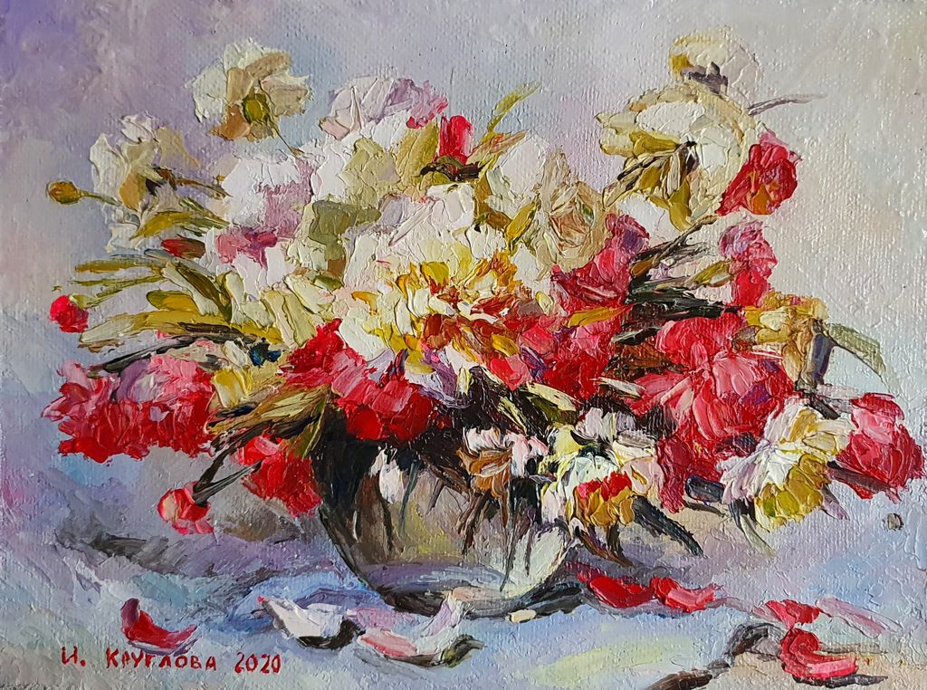Круглова Ирина "Яркий пионовый букет", холст на оргалите / масло, 17 х 22 см., 2020 г.
