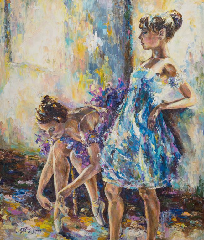 На картине изображены балерины за кулисами во время приготовления к спектаклю. Работа построена на сопоставлении контрастов душевного состояния персонажей, и наполнена внутренним драматизмом, который положен в основу композиции картины. Лаконичный фон контрастирует с изысканным ремеслом