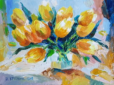 Круглова Ирина "Желтые тюльпаны", двп / масло, 14 х 19 см., 2018 г.